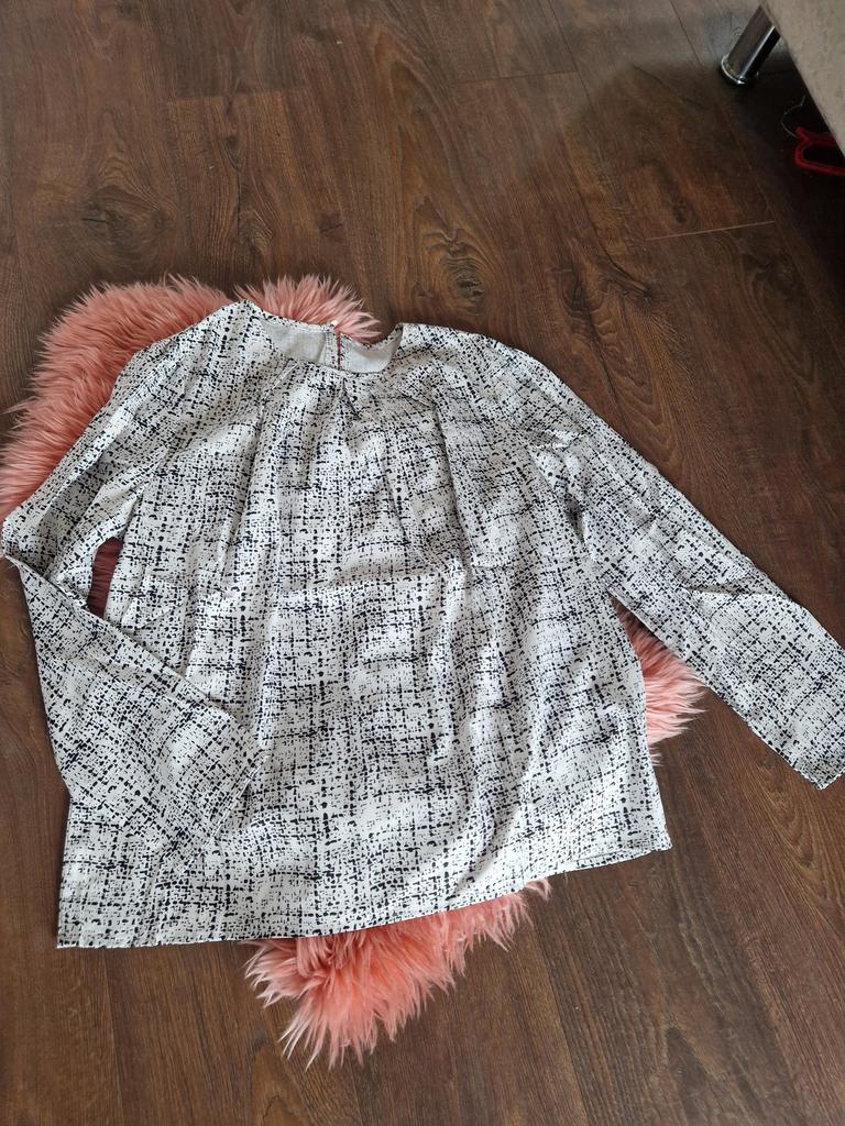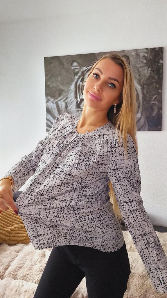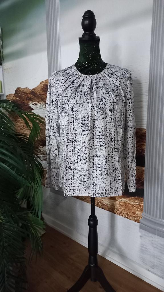 Krásná klasická halenka, perfektní k džínům, sukni, blejzru. Velmi pěkný vzor, dlouhé rukávy, syntetická tkanina je velmi lehká, má knoflík na zádech. Velikost xl dobře sedí na hrudník 100 cm. Doručení do Irska trvalo 20 dní. Šťastné nakupování!