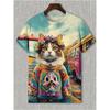 Summer Round Neck Artistic Cat and Floral Pattern 3D Print Top Fashionable Casual Short Sleeved Men's T-shirts