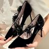 96502 high heels women's thin heels 2025 new French color matching pointed head light mouth suede temperament flower single shoes