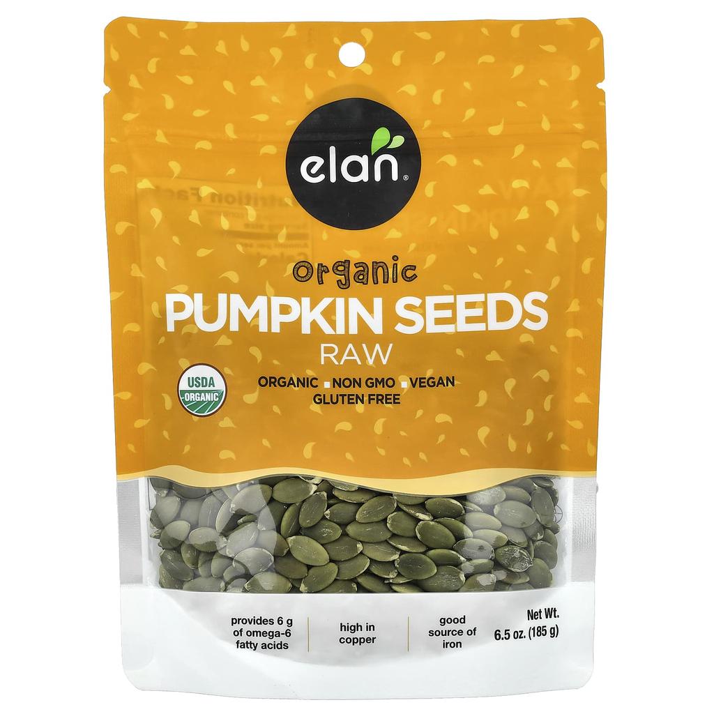 Product Description: USDA Certified Organic, Non-GMO, Vegan, Provides 6g of Omega-6 Fatty Acids, Rich in Copper, Excellent Source of Iron, Delicious, Good for You®, Ecocert Canada Certified Organic, Beyond Celiac - Gluten-Free Certification Program, OR Kosher, Origin: China. Experience the benefits of Elan's Organic Raw Pumpkin Seeds. These seeds offer a subtle, nutty flavor and a delightful texture that make them a favorite snack. Rich in copper and magnesium, these seeds provide a boost of energy throughout the day or make a healthy addition to salads, yogurt, and baked goods. Boost your health with the nutritional benefits of pumpkin seeds!